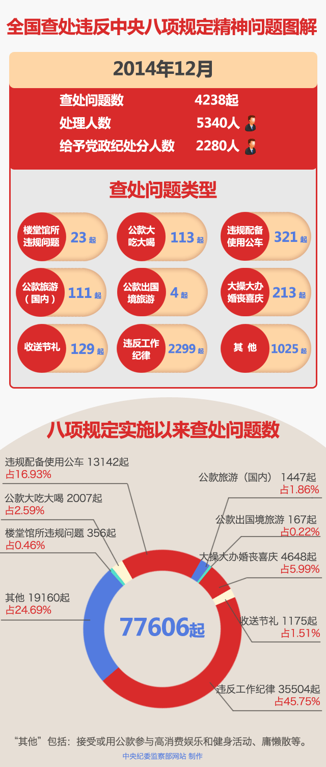 为掌握全国贯彻落实八项规定精神情况,中央纪委在31个省区市和新疆生产建设兵团、59个中央和国家机关建立了落实中央八项规定精神情况月报制度。截至2014年12月31日,全国查处违反中央八项规定精神问题情况如下: