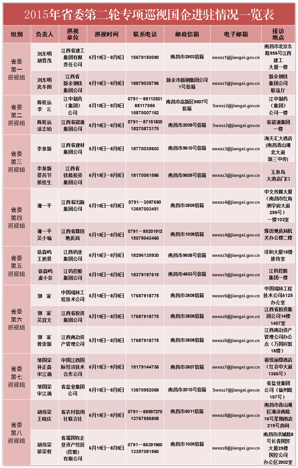 根据江西省委统一部署,今年江西第二轮巡视工作将对17家省属国有企业开展专项巡视。目前,省委8个巡视组全部进驻到位。 本轮专项巡视将盯住重点人、重点事和重点问题。重点人指的是十八大后不收敛不收手,问题线索反映集中、群众反映强烈,现在重要岗位且可能还要提拔使用的领导干部。重点事指的是“四资一项目”,即资产管理、资产处置、资源配置、资本运作和工程项目等方面反映突出的具体事项。重点问题,主要是指国有企业“三重一大”方面的腐败问题。 各巡视组均公布了巡视期间的专门联系电话、邮政信箱、电子邮箱和接访地点,受理举报反映。(江西省纪委)