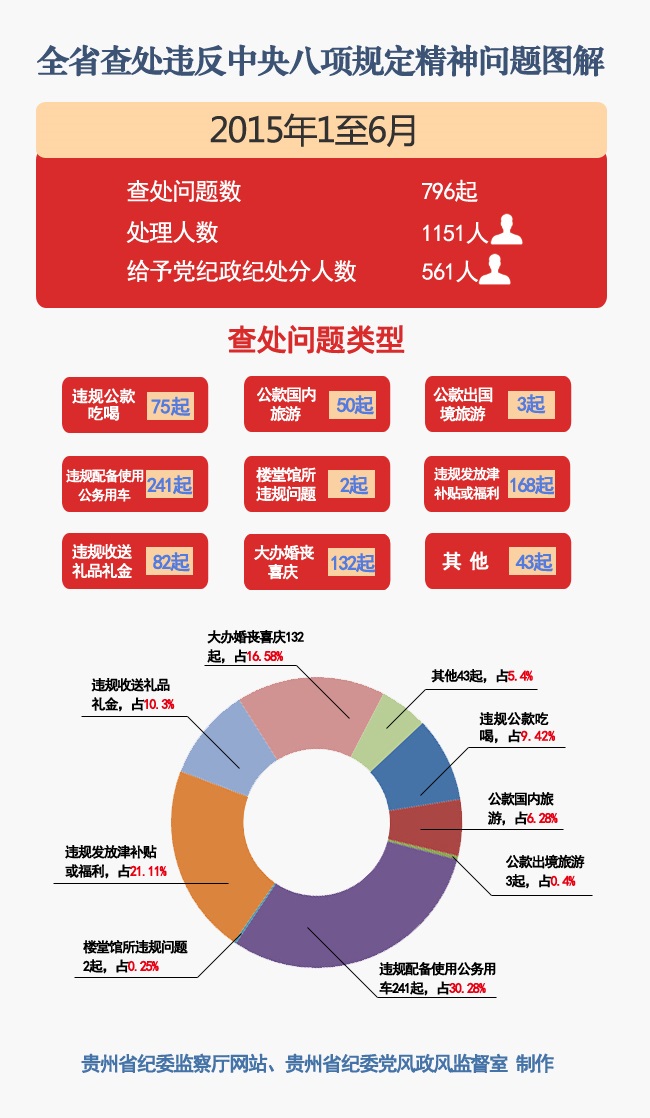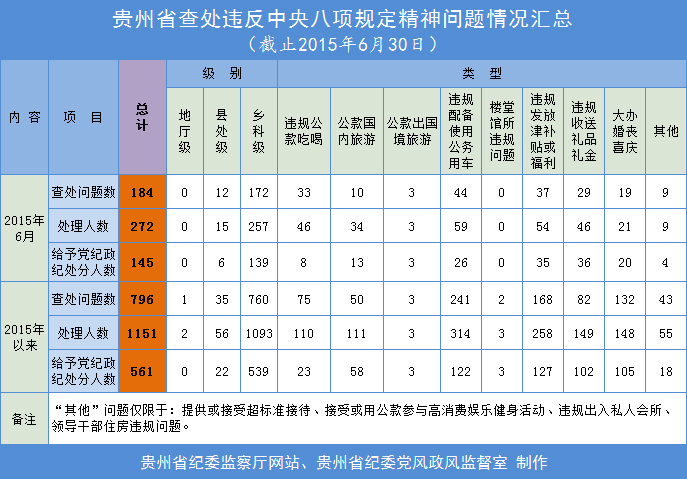 图为2015年1至6月贵州省查处违反中央八项规定精神问题汇总表 今年以来,贵州省各级纪检监察机关紧盯“四风”问题新形式新动向,把违反中央八项规定和省委十项规定精神列入党的纪律审查重点,进一步畅通社会监督渠道,加大执纪监督、公开曝光力度,坚决防止“四风”问题反弹。1至6月,全省共查处违反中央八项规定精神问题796起,处理1151人,包括地厅级2人,县处级56人,乡科级干部1093人,共有561人受到党纪政纪处分。