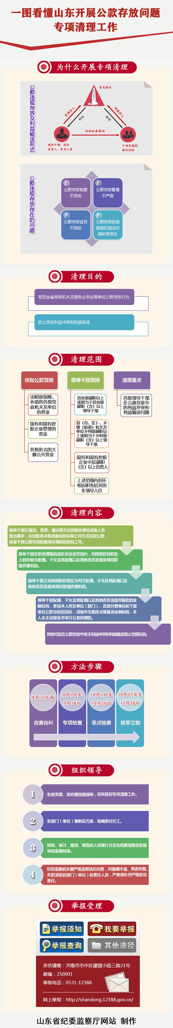把公款存放到领导干部亲属所在的或指定的银行,其亲属因此获得高额奖金、提成加薪和职位晋升等回报……近年来,党员干部特别是领导干部利用公款存放谋取私利现象屡屡发生。对此,山东省委办公厅、省政府办公厅日前发出通知,部署开展专项清理工作,规范党政机关及国有企业事业等单位公款存放行为,防止发生利益冲突和利益输送问题。 此次清理的公款范围,主要是由财政保障、补助的各级党政机关及单位的资金,国有和国有控股企业管理的资金。重点清理各级领导干部在公款存放中的利益冲突和利益输送问题。 清理的具体内容包括:领导干部以指定、授意、暗示等方式向相关单位或者人员提出要求,未经集体决策或者招投标等公开方式存放公款,或者干预公款存放的集体决策和招投标工作的;领导干部在职务管辖的地区和业务范围内,利用职权和职务上的影响为配偶、子女及其配偶以及其他直系亲属承揽存款提供便利的;领导干部之间利用职权相互为对方配偶、子女及其配偶以及其他直系亲属承揽存款提供便利的;领导干部配偶、子女及其配偶以及其他直系亲属所服务的金融机构,参加本人所在单位(部门)、直接分管单位和下属单位公款存放招投标,或者作为集体决策备选金融机构,本人未主动报告并实行公务回避的;其他可能在公款存放中发生利益冲突和利益输送禁止性情形的。 清理工作分自查自纠、专项检查、重点抽查、建章立制四个阶段进行,到今年底前完成。各级纪检监察机关将严格监督执纪问责,对隐瞒不报、弄虚作假、失职渎职的部门(单位)和责任人员予以严肃查处。