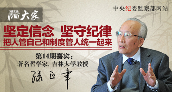 孙正聿接受本网专访 “把权力关进制度笼子里,把纪律规矩挺在前沿,真正地落实下去,永远面临一个问题,就是让人管住自己” 问:全面从严治党,既要把理想信念宗旨这个核心价值观作为高标准,又要守住党的纪律这条底线。要把纪律和规矩挺在前面,小错提醒、动辄则咎,坚持高标准、绝不允许突破底线。请谈谈您的理解。 孙正聿:我觉得这句话实际上是要求我们理解一个辩证关系,就是坚定理想信念和坚守纪律规矩的关系,或者也可以说是人管自己和制度管人的关系。我特别欣赏中国有句古话叫“非不能也,是不为也”,就是说,我不是不能做那些事情,但是我不去做那些事情。我手中有权,但我不以权谋私;我手中有钱,但我不肆意挥霍;我知道所谓各种潜规则,但我不随波逐流。那么,人为什么能够管住自己呢?就在于他有理想信念。这就是说你有一种坚定的理想信念,你有一个崇高的追求,对于手中的权,你就知道怎么用了;手中的钱,你就知道怎么花了;所谓的潜规则,你就知道怎么对待它了。所以,我想反腐倡廉的一个永恒的主题是要坚定理想信念。只有从世界观、人生观、价值观上解决问题,才能够解决根本问题。人管住了自己,这仅仅是问题的一个方面,所以我还想把前面的那句古话颠倒过来说,叫做“非不为也,是不能也”,不是他不想干坏事,是他干不了坏事。这就是现在常说的“不敢腐、不能腐、不想腐”,也就是把我们所说的坚持理想信念与把纪律和规矩挺在前沿结合起来。 在实际工作的过程当中,往往容易去强调制度这个方面,而容易忽视理想信念、人的精神生活这个方面。我想我们真正做到把权力关进制度笼子里,把纪律规矩挺在前沿,真正地落实下去,永远面临一个问题,就是让人管住自己。如果人要管不住自己,老百姓有句话,上有政策,下有对策,他总有可以打擦边球的地方。所以,我想这两方面是不可偏废的,只有把坚定理想信念和坚守纪律规矩,把人管自己和制度管人统一起来,我们才能够真正把党风廉政建设和反腐败这项重大的工作更加有效地开展下去。 “把纪律和规矩挺在前沿,就是要解决‘小恶变成大患’的问题。让人没病别得病,小病不变成大病” 问:您如何看待“四个全面”战略布局中的“全面从严治党”? 孙正聿:党的十八大以来,无论从贯彻中央八项规定精神、坚决纠正“四风”,还是“老虎苍蝇一起打”,都体现了新一届党中央全面从严治党的决心和勇气,也确确实实取得了实际成效,这也是大家有目共睹的。抓出“老虎”对于我们党和人民来说,一方面是好事,但另一方面也是让我们痛心疾首的事。培养一个高级干部不容易,他从原来那种状态变成后来那种状态,我们应该感到痛心,所以我们应该让咬耳扯袖、红脸出汗成为常态,发现苗头及时处理,改变要么是“好同志”、要么是“阶下囚”的状况。把纪律和规矩挺在前沿,就是要解决“小恶变成大患”的问题,不是说抓出来越多越好,而是要防患于未然,让人没病别得病,小病不变成大病。从这个意义上讲,也要强调人管自己和制度管人。我们应该从制度安排上解决问题,让好人不变坏,让坏人不敢坏,我觉得这个是根本。