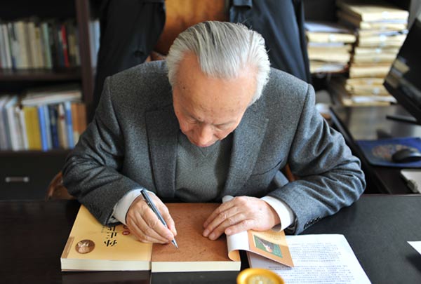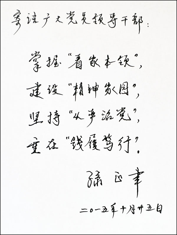 孙正聿赠书给本网 “对我个人来说,为了梦想,需要去坚守自己的追求,能够在自己的岗位上做出更大贡献。伟大的中国梦是我们共同奋斗出来的” 问:请谈谈您心中的中国梦。 孙正聿:梦想并不是抽象的、空洞的、虚幻的。梦想是历史性的,是分层次的,是有具体内涵的,是有现实基础的。西方人文主义心理学家马斯洛说,人的需要是从生存需要、安全需要、归属需要、尊重需要、审美需要到自我实现需要;我国哲学家冯友兰先生说,人生有四种境界:自然境界、功利境界、道德境界最后达到天地境界。对于我们今天的中国梦来说,应当有个最基本的思考前提,那就是我们坚持马克思主义的世界观。马克思要追求的梦想是每个人的自由而全面的发展,这也是我们所坚守的马克思主义世界观的梦想。你问我的梦想是什么?按照马克思主义的理解,我们追求的梦想就是,或者更标准地用马克思的话来说,就是以每个人的全面而自由的发展为前提的一切人的自由而全面的发展,或者更简洁地说:人的全面发展。这种人的全面发展落实到中国现实,就是习近平总书记说的,我们现在所做的一切都是为了能够去实现人民的向往,实现人民的幸福。所以,我们在想今天中国梦的时候,能够很好地把马克思所设想的这样一种人类的发展、人的一种文明的程度,和习近平总书记所提出的我们的中国梦,能够统一起来。对我个人来说,为了梦想,需要去坚守自己的追求,能够在自己的岗位上做出更大贡献。健康的体魄是锻炼出来的,真实的本领是钻研出来的,美好的心灵是修养出来的,成功的人生是拼搏出来的,伟大的中国梦是我们共同奋斗出来的。 “掌握看家本领,建设精神家园,坚持从严治党,重在践履笃行” 问:请您为广大党员干部题写一段寄语。 孙正聿:我写的是:掌握看家本领,建设精神家园,坚持从严治党,重在践履笃行。无论是对于广大党员干部安身立命来说也好,还是对于我们的党风廉政建设和反腐败工作来说也好,首先第一位的是什么呢?是习近平总书记所强调的,系统地掌握马克思主义的基本原理这个看家本领。掌握看家本领不是一句空的话,落实下来,我想首先是能够去充实建设我们自己的精神家园,而我们的精神家园是以理想信念为灵魂的,所以说我们必须系统地掌握看家本领,掌握了看家本领才能够充实我们的精神家园。在我们的实际工作当中,我们不仅仅是要人管自己,还要制度管人,所以我们在倡导每个党员干部都要系统掌握看家本领的同时,还必须坚持从严治党。无论是人管自己,还是制度管人,说到底是践履笃行。