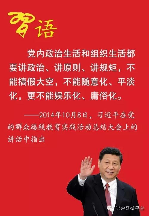 党内政治生活和组织生活都要讲政治、讲原则、讲规矩,不能搞假大空,不能随意化、平淡化,更不能娱乐化、庸俗化。
