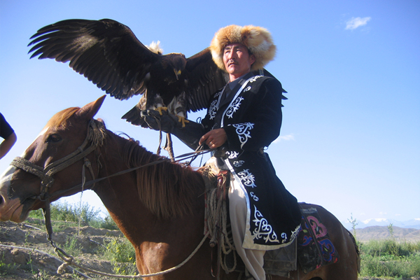 哈萨克族猎鹰人 鹰猎是哈萨克族独特的狩猎方式。强悍的哈萨克猎手,矫健的天马,凶猛的猎鹰,在萨吾尔山的草原上,伴着悠扬美妙的冬不拉旋律。 (新疆维吾尔自治区吉木乃县纪委 阿来/文 李长民/图)