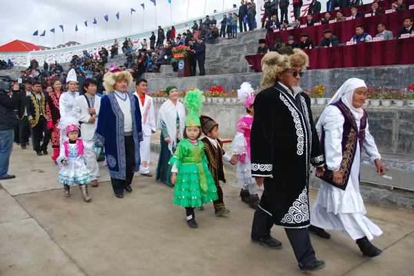 冰山艺术节哈萨克族阿肯弹唱队 “阿肯”哈萨克语中意为民间歌手。在一年一度的“冰山艺术节”中,哈萨克族阿肯们以个人弹唱和双人对唱的形式,抱起古老的冬不拉(哈萨克族传统乐器),唱响民族团结之歌。