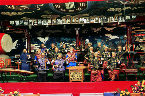 演奏纳西古乐 纳西古乐是融汉族道教洞经音乐、儒教典礼音乐和纳西先民音乐的古典音乐,被赞誉为“音乐活化石”。