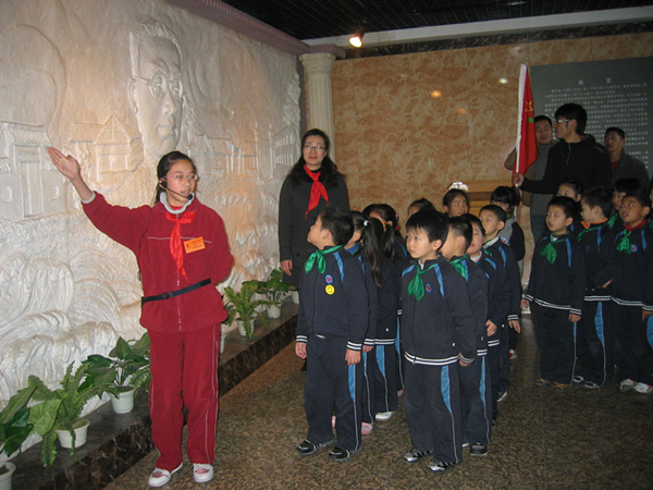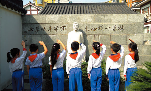 小学生在陶行知汉白玉雕像前敬礼 陶行知是伟大的人民教育家,一生辛劳,两袖清风,他“捧着一颗心来,不带半根草去”的崇高品格,泽被后世,影响深远。 (上海市宝山区纪委)