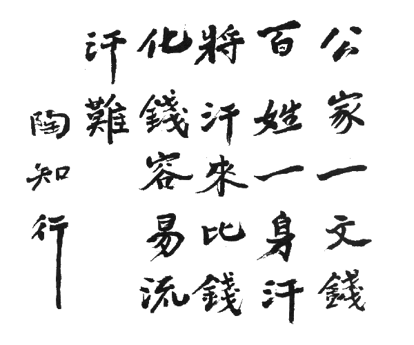 陶行知先生手迹《一文钱》 “公家一文钱,百姓一身汗。将汗来比钱,化钱容易流汗难。”这首诗发表于1934年6月16日陶行知主编的《生活教育》半月刊。陶行知经常以这首诗来教人律己。