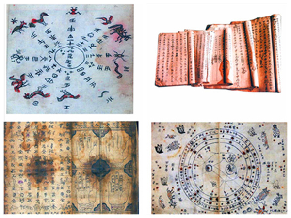 从古代遗留下来的手抄水书 水书文字主要记录在水书卷本中,由民间水书先生用竹签、毛笔抄录在夹纸上装订成册,目前留存的手抄水书大多是明代以后的版本,来自多家水书先生传抄誊写。