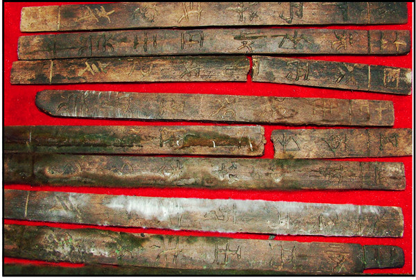 年代久远的竹签水书 水书文字的结构多为象形,它保留着水族远古文明信息。在水族地区,水书仍被广泛使用,被人们誉为“象形文字的活化石”。
