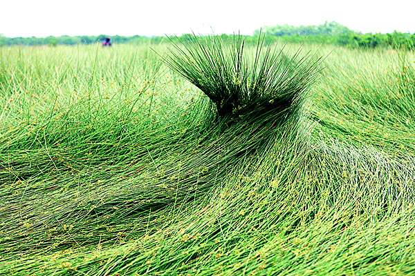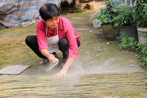 收割绿油油的蔺草后,草席编织人会用谷草烧成的草木灰撒在上面,在夏天的阳光中晒上几天。
