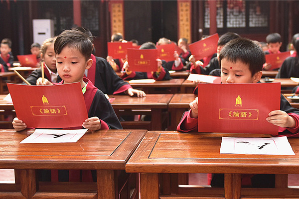 四川省都江堰市一所小学组织新入学学生以诵读《论语》的形式开展传统文化教育。(成都市纪委)