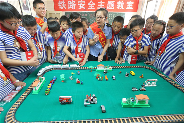 8月29日,来自河南郑州铁路局的一线铁路职工组成志愿者队伍,利用宣传版面、沙盘、游戏等形式,为三门峡市外国语小学师生奉上一堂生动的铁路安全知识课。(河南省灵宝市纪委)