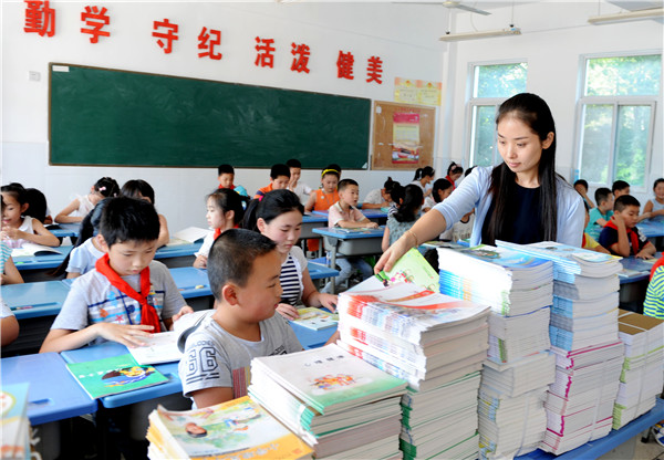 9月1日,江苏省金湖县4万余名中小学生开始新学期的学习生活。图为老师正在为学生分发新课本。(江苏省淮安市金湖县纪委)