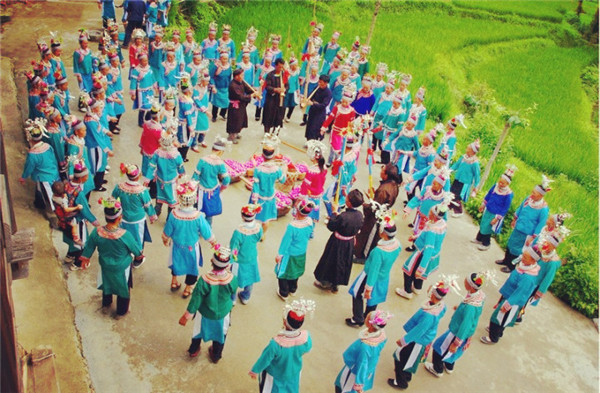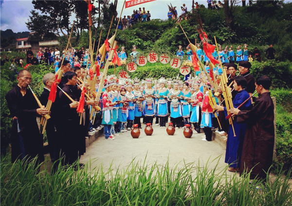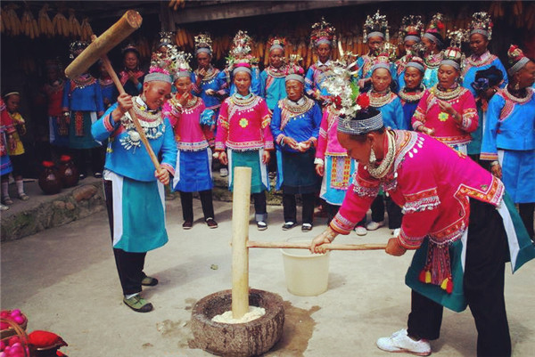 吹起芦笙,端起拦门酒,欢迎远方的客人 每逢喜庆节日,苗族同胞都要杀猪宰羊,穿着自制民族盛装,敲起铜鼓,吹起芦笙、长号,备好红鸡蛋、拦门酒,跳起芦笙舞,盛邀十里八乡的亲友一起体验打糍粑、苗家长桌宴、原生态婚礼等丰富多彩的活动。