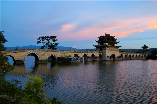 云南·双龙桥 双龙桥位于云南省红河州建水县,是座三阁十七孔大石拱桥,横跨泸江与塌冲河交汇之水面上。(云南省红河州建水县纪委)