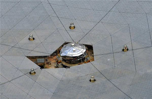 2016年6月,从观景台上拍摄的建设中的射电望远镜馈源舱 借助这只巨大的“天眼”,科研人员可以窥探星际之间互动的信息,观测暗物质,测定黑洞质量,甚至搜寻可能存在的星外文明,这也将为世界天文学的新发现提供重要机遇。