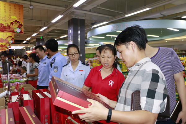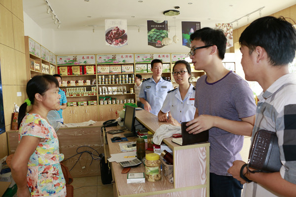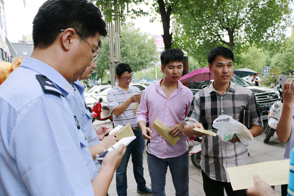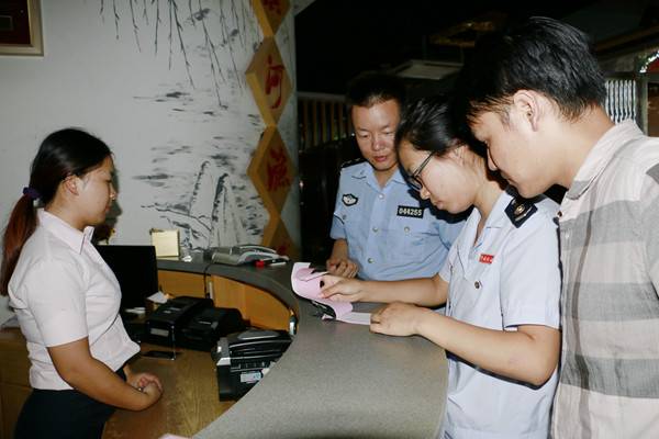 临近饭点,在某大酒店对一可疑发票进行认真辨别。