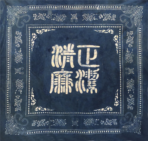 蓝印花布作品《清正廉洁》 江苏南通民间至今仍继承着这一古老的印染工艺,并不断赋予其新的活力,已成为全国著名的蓝印花布特产地。