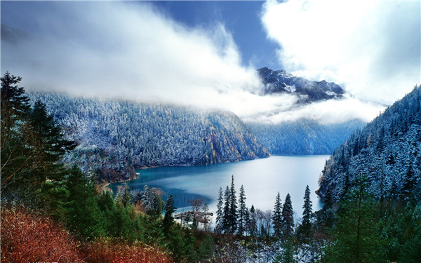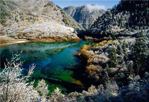 九寨沟位于四川省阿坝藏族羌族自治州九寨沟县漳扎镇境内,因沟内有树正、荷叶、则查洼等九个藏族村寨而得名。九寨沟“仲春树绿花艳、盛夏幽湖翠山、金秋尽染山林、隆冬冰塑自然”,以翠湖、叠瀑、彩林、雪峰、藏情、蓝冰“六绝”著称于世,被誉为“人间仙境”、“童话世界”。