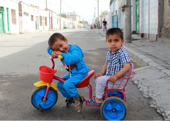 看看我的“靓车” 在新疆维吾尔自治区新和县新和镇尤鲁都斯阔恰社区,维吾尔族小朋友收到了结对的汉族“亲戚”送来的儿童节礼物:一辆三轮童车。(新疆维吾尔自治区新和县纪委)