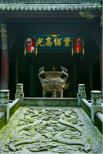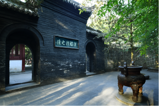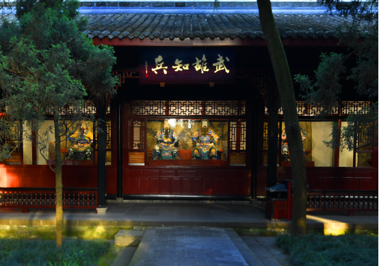 刘备殿 武侯祠是中国唯一一座君臣合祀祠庙,除了纪念诸葛亮,还有刘备及蜀汉英雄。清人完颜崇实写的“业绍高光”,是对刘备的最高赞誉。在刘备殿前两侧,文臣廊、武将廊分列左右,文善辅国,武雄知兵。