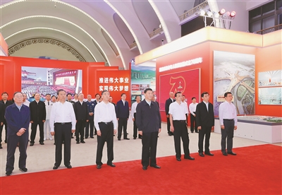 新华社北京9月23日电 在庆祝中华人民共和国成立70周年之际,中共中央总书记、国家主席、中央军委主席习近平23日前往北京展览馆,参观“伟大历程 辉煌成就——庆祝中华人民共和国成立70周年大型成就展”。他强调,新中国成立70年来,我们党不忘初心、牢记使命,团结带领全国各族人民战胜了一个又一个艰难险阻,创造了一个又一个彪炳史册的人间奇迹,中华民族迎来了从站起来、富起来到强起来的伟大飞跃。70年来我国取得的历史性成就、发生的历史性变革,充分说明只有中国共产党才能领导中国,只有社会主义才能救中国,只有改革开放才能发展中国、发展社会主义、发展马克思主义,只有中国特色社会主义道路才能引领中国走向繁荣富强。70年后再出发,而今迈步从头越。要展示好、宣传好新中国波澜壮阔的发展历程、感天动地的辉煌成就、弥足珍贵的经验启示,激励全党全国各族人民更加紧密地团结在党中央周围,高举中国特色社会主义伟大旗帜,团结一致、锐意进取,为决胜全面建成小康社会、夺取新时代中国特色社会主义伟大胜利、实现中华民族伟大复兴的中国梦、实现人民对美好生活的向往而不懈奋进。 李克强、汪洋、王沪宁、赵乐际、韩正、王岐山参观展览。 下午4时10分许,习近平等党和国家领导同志来到北京展览馆,步入展厅参观展览。展览以开辟和发展中国特色社会主义道路、建设社会主义现代化国家为主题,以编年体为时间主线,安排设计了5个部分,并体现历次党代会和重要中央全会、五年规划(计划)等方面的跨段主线,选择150个“新中国第一”进行展示,每10年设置英雄模范人物墙,充分运用声光电等多媒体科技展示手段,全方位立体化呈现新中国成立70年来中国共产党领导中国人民发愤图强、艰苦奋斗实现的伟大跨越,清晰展现党的领导和我国社会主义制度集中力量办大事的政治优势,深刻揭示新中国70年巨变背后的深刻道理。 记录开国大典历史时刻的影像,纪念新中国建设的第一条铁路成渝铁路建成通车的浮雕,定格恢复中华人民共和国在联合国一切合法权利瞬间的照片,寓意1977年恢复高考以来几代人命运得以改变的场景,展现安徽小岗村18户农民在“大包干”契约上按下鲜红手印的群像,反映上海浦东开发开放旧貌换新颜的视频,显现1998年抗洪抢险中万众一心、众志成城的场面,再现北京奥运会盛况的光影设计,中国自主研发的第一座快中子反应堆模型,展现全面深化改革进程的说明,反映高质量发展的成果,体现“绿水青山就是金山银山”生动实践的沙盘,展示人民军队官兵在强军目标指引下奋勇前进的展板,呈现脱贫攻坚新进展的实景,描绘区域发展战略的地图,模拟月球车、“天眼”等的模型,世界最长跨海大桥港珠澳大桥模型,体现全方位外交的展板……展览长廊犹如时光隧道,一张张图片展板、一件件实物模型、一段段视频资料、一项项互动体验,吸引了习近平等领导同志的目光,他们不时驻足观看,认真听取讲解,询问有关情况。 在京中共中央政治局委员、中央书记处书记,全国人大常委会副委员长,国务委员,最高人民检察院检察长,全国政协副主席以及中央军委委员等参观了展览。 |
