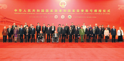 本报北京9月29日电 (记者赵兵)中华人民共和国国家勋章和国家荣誉称号颁授仪式29日上午在北京人民大会堂金色大厅隆重举行。中共中央总书记、国家主席、中央军委主席习近平向国家勋章和国家荣誉称号获得者颁授勋章奖章并发表重要讲话。习近平强调,崇尚英雄才会产生英雄,争做英雄才能英雄辈出。英雄模范们用行动再次证明,伟大出自平凡,平凡造就伟大。只要有坚定的理想信念、不懈的奋斗精神,脚踏实地把每件平凡的事做好,一切平凡的人都可以获得不平凡的人生,一切平凡的工作都可以创造不平凡的成就。(讲话全文见第二版) 习近平强调,一切伟大成就都是接续奋斗的结果,一切伟大事业都需要在继往开来中推进。新时代必将是大有可为的时代。全党全国各族人民要像英雄模范那样坚守、像英雄模范那样奋斗,共同谱写新时代人民共和国的壮丽凯歌。 中共中央政治局常委李克强、栗战书、汪洋、赵乐际、韩正,国家副主席王岐山出席颁授仪式。中共中央政治局常委王沪宁主持。 9时许,国家勋章和国家荣誉称号获得者集体乘坐礼宾车从住地出发,由国宾护卫队护卫前往人民大会堂。人民大会堂东门外,高擎红旗的礼兵分列道路两侧,肩枪礼兵在台阶上庄严伫立,青少年热情欢呼致意。国家勋章和国家荣誉称号获得者沿着红毯拾级而上,进入人民大会堂东门。党和国家功勋荣誉表彰工作委员会领导同志在这里集体迎接他们到来。 人民大会堂金色大厅,气氛热烈庄重。巨幅红色背景板上,共和国勋章、友谊勋章、国家荣誉称号奖章图案熠熠生辉。背景板前,18面鲜艳夺目的五星红旗分列两侧,18名英姿挺拔的解放军仪仗队礼兵在授勋台两侧持枪伫立。 9时58分,伴着欢快的乐曲,习近平同国家勋章和国家荣誉称号获得者一同步入会场,全场起立,热烈鼓掌。 10时整,颁授仪式开始。解放军军乐团奏响《义勇军进行曲》,全场高唱中华人民共和国国歌。 王沪宁宣读习近平签署的中华人民共和国主席令。主席令指出,为了庆祝中华人民共和国成立70周年,隆重表彰为新中国建设和发展作出杰出贡献的功勋模范人物,弘扬民族精神和时代精神,根据第十三届全国人民代表大会常务委员会第十三次会议的决定,授予于敏等8人共和国勋章,授予劳尔·卡斯特罗·鲁斯等6人友谊勋章,授予叶培建等28人国家荣誉称号。 2名护旗手高擎五星红旗,3名礼兵手捧共和国勋章、友谊勋章和国家荣誉称号奖章,迈着雄健的步伐,行进到仪式现场。 在雄壮激昂的《向祖国致敬》乐曲声中,习近平为国家勋章和国家荣誉称号获得者一一颁授勋章奖章,并同他们亲切握手、表示祝贺,全场响起一阵阵热烈的掌声。少先队员向这些功勋模范人物献上美丽的鲜花,敬礼致意。 在全场热烈的掌声中,习近平发表重要讲话。他首先代表党中央、全国人大、国务院和中央军委,向今天获得共和国勋章和国家荣誉称号的英雄模范、获得友谊勋章的国际友人表示热烈的祝贺、致以崇高的敬意。 习近平指出,今天受表彰的国家勋章和国家荣誉称号获得者,是千千万万为党和人民事业作出贡献的杰出人士的代表。他们身上生动体现了中华民族精神和社会主义核心价值观,他们的事迹和贡献将永远写在共和国史册上。 习近平强调,党和国家历来高度重视对英雄模范的表彰。今天我们以最高规格褒奖英雄模范,就是要弘扬他们身上展现的忠诚、执着、朴实的鲜明品格。英雄模范们都对党和人民事业矢志不渝、百折不挠,都在党和人民最需要的地方冲锋陷阵、顽强拼搏,都在平凡的工作岗位上忘我工作、无私奉献,其中很多同志都是做隐姓埋名人、干惊天动地事的典型,展现了一种伟大的无我境界。希望受到表彰的同志珍惜荣誉、再接再厉,用坚定的信仰、信念、信心影响更多的人。各级党委和政府要关心、关怀、关爱英雄模范,推动全社会敬仰英雄、学习英雄,用实际行动为实现“两个一百年”奋斗目标、实现中华民族伟大复兴的中国梦贡献力量。 习近平指出,今天,受到表彰的还有长期给予我们支持和帮助的中国人民的老朋友、好朋友。我们衷心感谢他们对中国发展作出的贡献。中国人民愿同世界各国人民一道,推动构建人类命运共同体,让我们这个星球越来越美好。 仪式上,共和国勋章获得者黄旭华、友谊勋章获得者玛哈扎克里·诗琳通代表国家勋章和国家荣誉称号获得者发言。 颁授仪式后,习近平等领导同志同大家合影留念。 在京中共中央政治局委员、中央书记处书记,部分全国人大常委会副委员长,国务委员,最高人民法院院长,最高人民检察院检察长,部分全国政协副主席,中央军委委员出席颁授仪式。 中央党政军群有关部门和北京市负责同志,国家勋章和国家荣誉称号获得者及其亲属代表、所在单位代表,八一勋章获得者、全国先进模范人物代表,有关国家驻华使节,各界干部群众代表等约1000人参加颁授仪式。 |