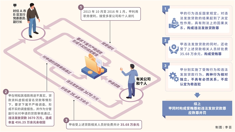 特邀嘉宾 张皓宇重庆市荣昌区纪委常委 杨一龙中国农业银行重庆开州支行党委委员、纪委书记 龙琎琎重庆市铜梁区人民检察院四级高级检察官 杨建重庆市铜梁区人民法院四级高级法官 本案中,甲多次以民间借贷名义收取“利息”,为何有的认定为违纪,有的认定构成受贿犯罪?有观点认为,甲审核同意发放贷款3670万元仅仅是发放贷款的一个环节,因此不构成违法发放贷款罪,如何看待该观点?对甲收受贿赂并违法发放贷款的行为,是应择一重罪处罚,还是按受贿罪和违法发放贷款罪数罪并罚?我们特邀相关单位工作人员予以解析。 基本案情: 甲,曾任某国有商业银行A市B区支行党委委员、副行长,A市C区支行党委委员、副行长,A市D区支行党委委员等职务。 违反廉洁纪律。2017年11月至2019年1月,甲在担任A市C区支行党委委员、副行长期间,筹集100万元出借给A市某林业发展公司(该公司为A市C区支行信贷客户,在此期间,该公司存在资金需求,同期向其他民事主体有多笔借款,且多笔借款所支付的月利率大于或等于3%),并按3%的月利率收取利息。2019年1月,甲收回本金100万元,累计收取利息45万余元。 受贿罪。2010年8月至2016年2月,甲在担任A市B区支行党委委员、副行长期间,利用贷款调查、审核等职务上的便利,为他人谋取利益,非法收受财物166万余元。 其中,2013年1月至2016年2月,乙关联的多家企业多次向A市B区支行申请贷款,贷款总额长期维持在1.2亿元以上,最高时达1.6亿余元。甲利用其担任B区支行党委委员、副行长分管公司业务部的职务便利,在乙关联企业申请贷款过程中为其提供帮助。甲为谋取私利主动向乙提出对外出借资金以收取高息的想法,乙为感谢甲在贷款办理过程中提供的帮助,在银行贷款已经满足其资金需求的情况下,无借款需求而主动应承向甲借款,并向甲表示以月利率3%的标准支付利息。甲明知乙没有资金需求,仍于2014年3月将自有资金和向其亲属丙筹集的100万元共200万元“借给”乙,双方仅口头约定按月利率3%支付利息,未签订借款协议、未约定还款期限。2014年4月,乙将首笔“利息”6万元转账到甲妻子账户,为逃避调查,甲授意此后通过其妻妹账户收取“利息”。2016年2月,甲调离A市B区支行到A市C区支行工作,乙遂将200万元本金归还甲,结束“借贷”关系。在此期间,乙未使用该200万元“借款”,甲收受乙以支付“利息”名义送予的好处费共计123万余元。因出借款中有100万元系丙提供,甲便将收取“利息”中的67万余元给了丙。 2013年10月至2016年1月,甲利用其担任A市B区支行党委委员、副行长的职务便利,向多家公司和个人违法发放贷款。甲收受上述贷款相关人员好处费共计35.68万余元。 违法发放贷款罪。2013年10月至2016年1月,甲利用其担任A市B区支行党委委员、副行长的职务便利,接受多家公司和个人请托,在明知其借款用途不真实、贷款资料虚假或冒名贷款等情形下,要求下属不严格调查、形成不实的调查报告,并作为分管副行长对相关公司和个人申请的贷款审核通过,违法发放贷款3670万元,造成本金456.25万余元未收回。 查处过程: 【立案审查调查】2023年5月8日,某国有商业银行A市分行纪委对甲涉嫌违纪问题立案审查;同日,A市D区监委对甲涉嫌严重职务违法犯罪问题立案调查。2023年5月19日,经A市监委批准,A市D区监委对甲采取留置措施。2023年8月14日,经A市监委批准,对甲延长留置时间三个月。 【党纪政务处分】2023年11月15日,某国有商业银行A市分行党委给予甲开除党籍处分;同日,某国有商业银行A市分行给予甲开除处分。 【移送审查起诉】2023年11月16日,A市D区监委将甲涉嫌受贿罪、违法发放贷款罪一案移送人民检察院审查起诉。后经指定管辖,由A市E区人民检察院审查起诉。 【提起公诉】2024年4月17日,A市E区人民检察院以甲涉嫌受贿罪、违法发放贷款罪向A市E区人民法院提起公诉。 【一审判决】2024年8月27日,A市E区人民法院以甲犯受贿罪,判处有期徒刑四年六个月,并处罚金30万元;犯违法发放贷款罪,判处有期徒刑五年,并处罚金10万元,数罪并罚,合并执行有期徒刑九年,并处罚金40万元。甲不服,提起上诉。 【二审裁定】2024年11月5日,A市第一中级人民法院裁定,驳回上诉、维持原判。 1甲将自有和向丙筹集的资金“借给”乙并收取123万余元“利息”行为是否构成受贿?其将“利息”中的67万余元给丙,是否影响受贿数额认定? 龙琎琎:国家工作人员利用职务便利为请托人谋取利益,采取放贷方式收受请托人财物(利息),属于放贷收息型受贿。判断国家工作人员放贷收息是否涉嫌受贿犯罪,要着重查明出借人是否为借款人谋利,借贷双方是否存在权钱交易基础。同时,可以参考最高人民法院《全国法院审理经济犯罪案件工作座谈会纪要》中关于以借为名收受贿赂的认定意见,从借款人是否有资金需求、借款去向、双方平时往来情况、借贷协议是否规范等方面,查明借贷双方是否存在真实借贷关系。实践中,放贷收息型受贿常见表现形式有三种:一是国家工作人员明知请托人没有资金需求而出借资金给请托人并收受利息;二是国家工作人员与请托人事先约定以放贷收息的方式掩盖行受贿行为;三是请托人确有借款需求,但给予国家工作人员的利率明显高于其他不特定借款对象。 本案属于国家工作人员明知请托人没有资金需求而放贷收息的情形,甲收受乙123万余元“