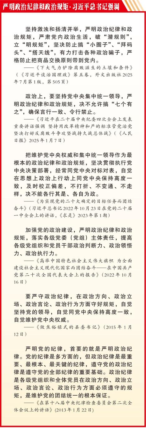 各级纪检监察机关深入学习贯彻习近平总书记重要讲话精神,紧盯党中央重大政策落地、重大项目执行、重大改革举措落实开展政治监督。图为四川省威远县纪检监察干部在某重点项目现场了解相关政策落实情况。代莹摄 必须严格执行政治纪律,带动各项纪律全面从严、一严到底。纪律的生命力在于执行,必须增强纪律执行刚性约束,让纪律成为带电的高压线。习近平总书记指出,“必须执行政治纪律,带动各项纪律全面从严、一严到底”。党的六项纪律,是以政治纪律为统领的完整严密体系。严明党的纪律首要就是严明党的政治纪律和政治规矩。各级党组织要把严守纪律、严明规矩放到重要位置来抓,努力在全党营造守纪律、讲规矩的氛围。对政治纪律和政治规矩,要十分明确地强调、十分坚定地执行,不要语焉不详、闪烁其词。 各级纪律检查机关作为党的“纪律部队”,要把维护党的政治纪律放在首位,深刻把握政治纪律和政治规矩的极端重要性,切实担负起维护党纪党规的重要职责,加强对政治纪律执行情况的监督检查,从严监督执纪问责。要坚持纪严于法、执纪执法贯通,深化运用“四种形态”政策策略,执纪必严、违纪必究,以严明的纪律确保全党目标一致、团结一致、步调一致。政治监督是督促全党坚持党中央集中统一领导的有力举措。要着力强化政治监督,紧紧围绕新时代新征程党的使命任务强化政治监督,推进政治监督具体化、精准化、常态化,确保党中央重大决策部署到哪里,政治监督就跟进到哪里,确保党中央决策部署落地生根、一贯到底,确保全党在思想上政治上行动上同党中央保持高度一致。要聚焦政治责任,把监督重点放在推动各级党委(党组)和党员领导干部特别是“一把手”履行管党治党政治责任上,以从严问责压紧压实责任落实。要聚焦党内政治生活,督促各级党组织严格落实民主集中制,进一步增强党组织的政治功能和组织功能。 “十五五”规划建议已经提出,前行的号角已经吹响。新时代新征程上,党员干部必须更加自觉遵守党的政治纪律和政治规矩,切实提高政治判断力、政治领悟力、政治执行力,增强“四个意识”、坚定“四个自信”、做到“两个维护”,为实现中国式现代化而不懈奋斗。 |